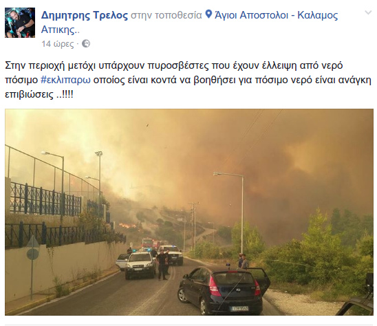 Εν συνεχεία το μεσημέρι προσέθεσε από το σημείο όπου βρισκόταν στους Αγίους Αποστόλους στον Κάλαμο Αττικής «Βρισκόμαστε 2χιλ δυτικά των Αγίων 3 οχήματα και 20 άντρες 4 από αυτούς πολίτες εθελοντές σε λυποθυμη κατάσταση χρειαζόμαστε νερό ψωμί και ότι άλλο μπορεί να μας βοηθήσει δεν θα υποχωρήσουμε αλλά χρειαζόμαστε την βοήθεια σας αφήστε ότι μπορείτε στα οχήματα της αστυνομίας η της πυροσβεστικής».