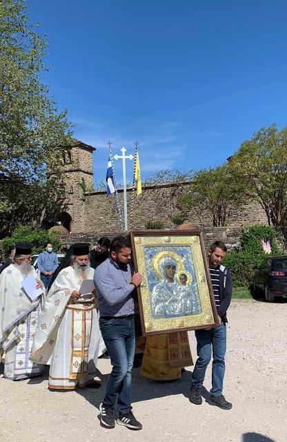 Μετὰ τὸ πέρας τῆς Θείας Λειτουργίας, πραγματοποιήθηκε ἡ καθιερωμένη λιτάνευση τῆς θαυματουργοῦ Εἰκόνος τῆς Παναγίας τῆς ἐπονομαζομένης Πωγωνιανιτίσσης (Μολυβδοσκεπάστου) ἔξω ἀπὸ τὰ τείχη τῆς Μονῆς κατὰ τὸ ἁγιορειτικό τυπικό. Μὲ τὴν θαυματουργὸ Εἰκόνα, σταυρώθηκαν νοητῶς τὰ τέσσερα σημεῖα τοῦ ὁρίζοντος, ὥστε νὰ εὐλογήσει ἡ Παναγία ὁλόκληρο τὸν κόσμο.