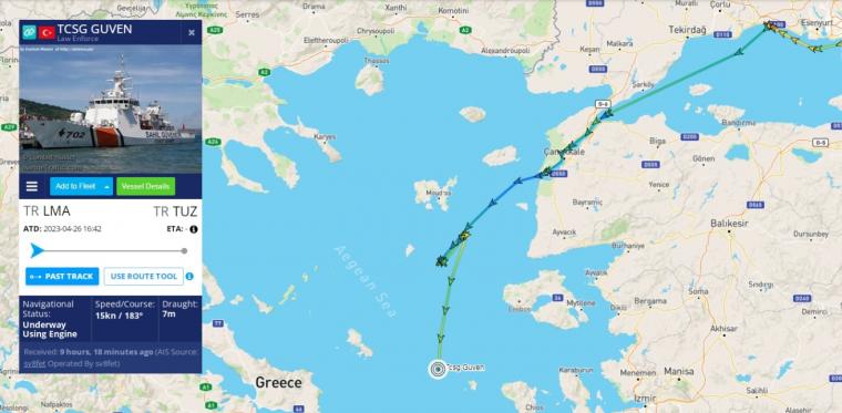 The Turkish Coast Guard corvette GUVEN after the completion of the Search and Rescue operation east of Agios Stratis with the discovery of the body of the man who appears to have fallen from the sailboat into the sea, instead of returning to its port in Istanbul and specifically the port of Tuzla, as declared, continued to sail south to the Cyclades, sailing as it seems to be heading for the Askazas naval station opposite Rhodes.