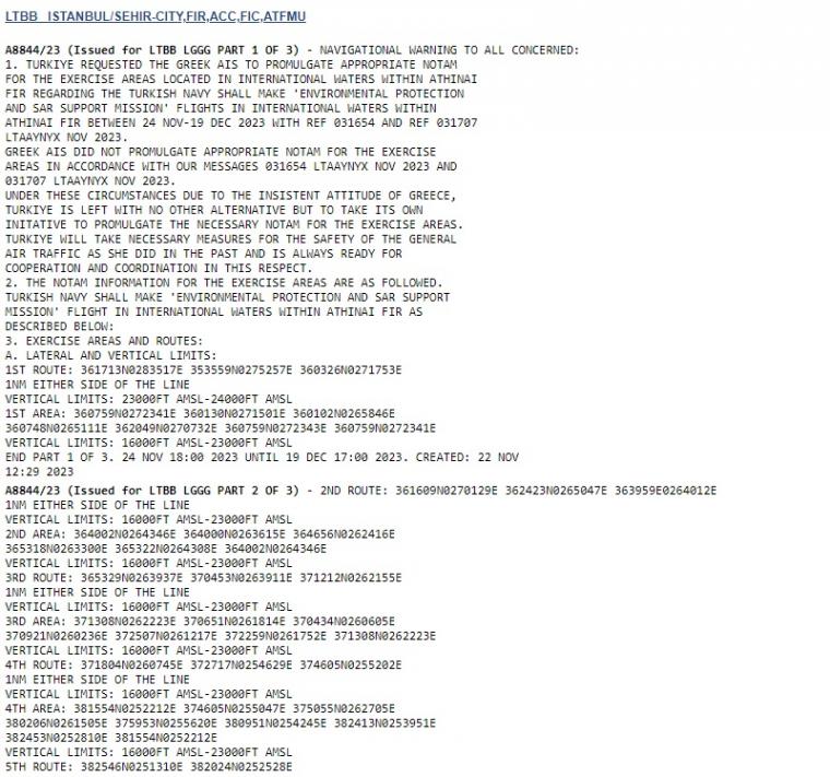 Turkey, without any jurisdiction, has proceeded to issue the illegal NOTAM A8844/23, by which it is blocking five areas from north to south from tomorrow, November 24 to December 19, for a "search and rescue and environmental protection" exercise.