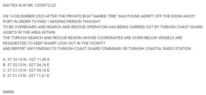 On Thursday Ankara issued NAVTEX 1205972/23 for a Search and Rescue operation for a person presumed missing as according to the Turkish directive to mariners he must have fallen from the private FRB vessel.