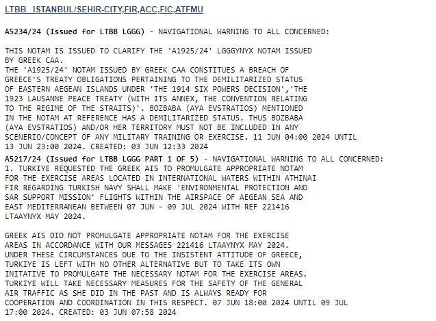 At the same time, Turkey with the illegal NOTAM A5217/24 blocked 5 areas in the Aegean Sea from north to south and very close to the 25th meridian for a Search and Rescue and Environmental Protection exercise from June 7 to July 9, while at the same time with the equally illegal NOTAM A5234/24 Turkey raised the issue of the demilitarization of Agios Stratis on the occasion of a Greek exercise.