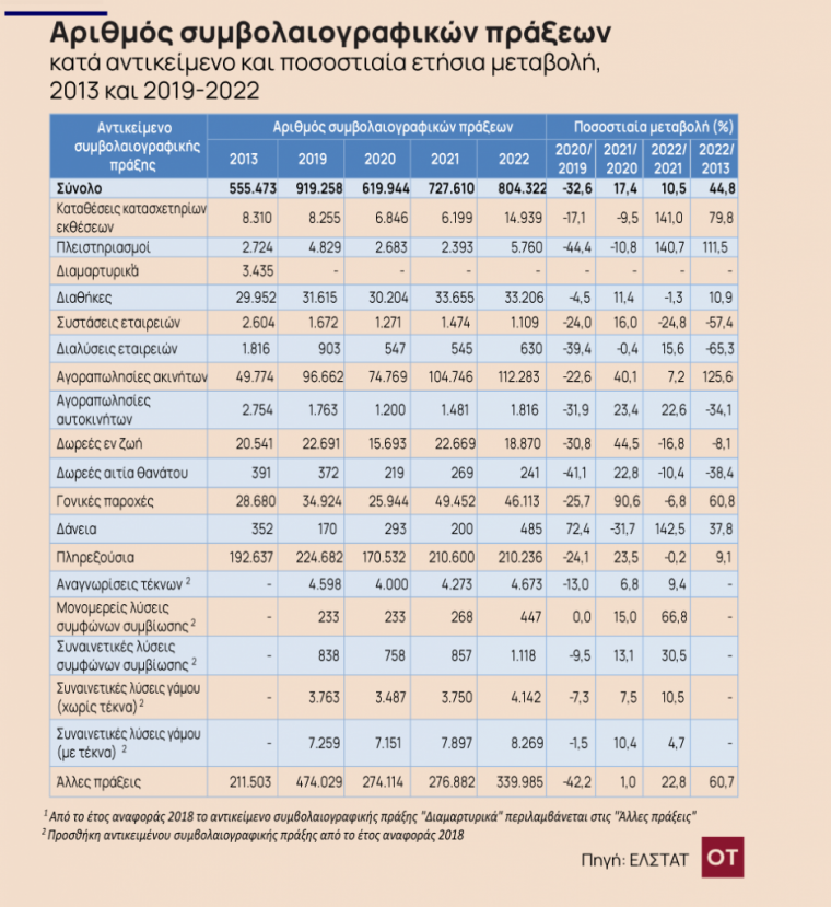 Στην έκθεση της ΕΛΣΤΑΤ ως προς τις εργασίες συμβολαιογράφων (2022) οι συμβολαιογραφικές πράξεις που πραγματοποιήθηκαν είναι δραματικά χαμηλότερες και ανέρχονται σε 804.322 έναντι 727.610 το 2021, παρουσιάζοντας αύξηση κατά 10,5%.