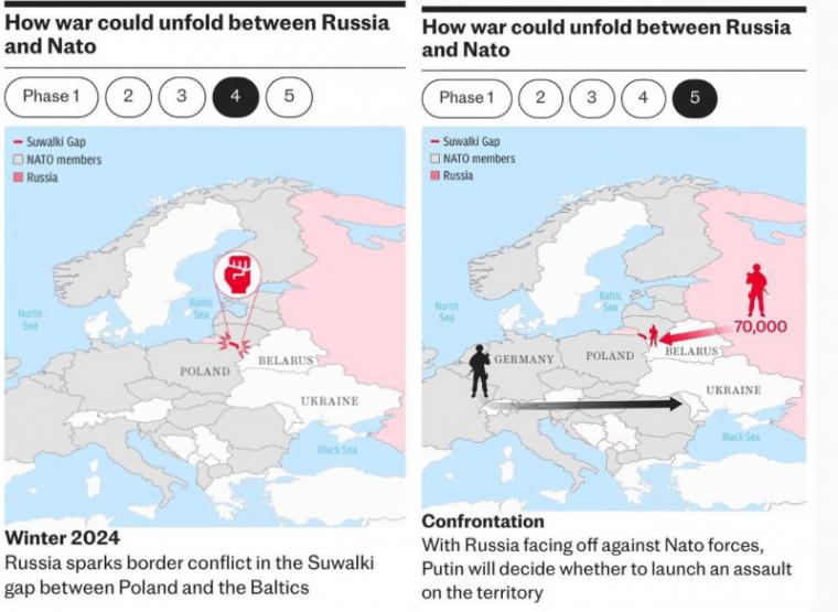 Η βρετανική εφημερίδα The Telegraph παρουσίασε ένα πιθανό σενάριο επίθεσης που μπορεί να εξαπολύσει ο Πούτιν κατά της Ευρώπης και κατά, ορισμένων χωρών-μελών του ΝΑΤΟ. Το σενάριο έχει πέντε στάδια και θα οδηγούσε τελικά σε άμεση αντιπαράθεση με τη Ρωσία.