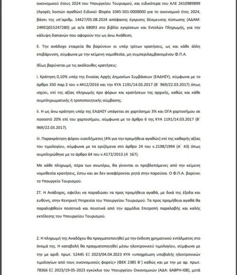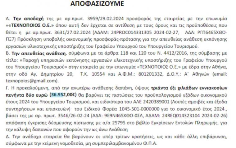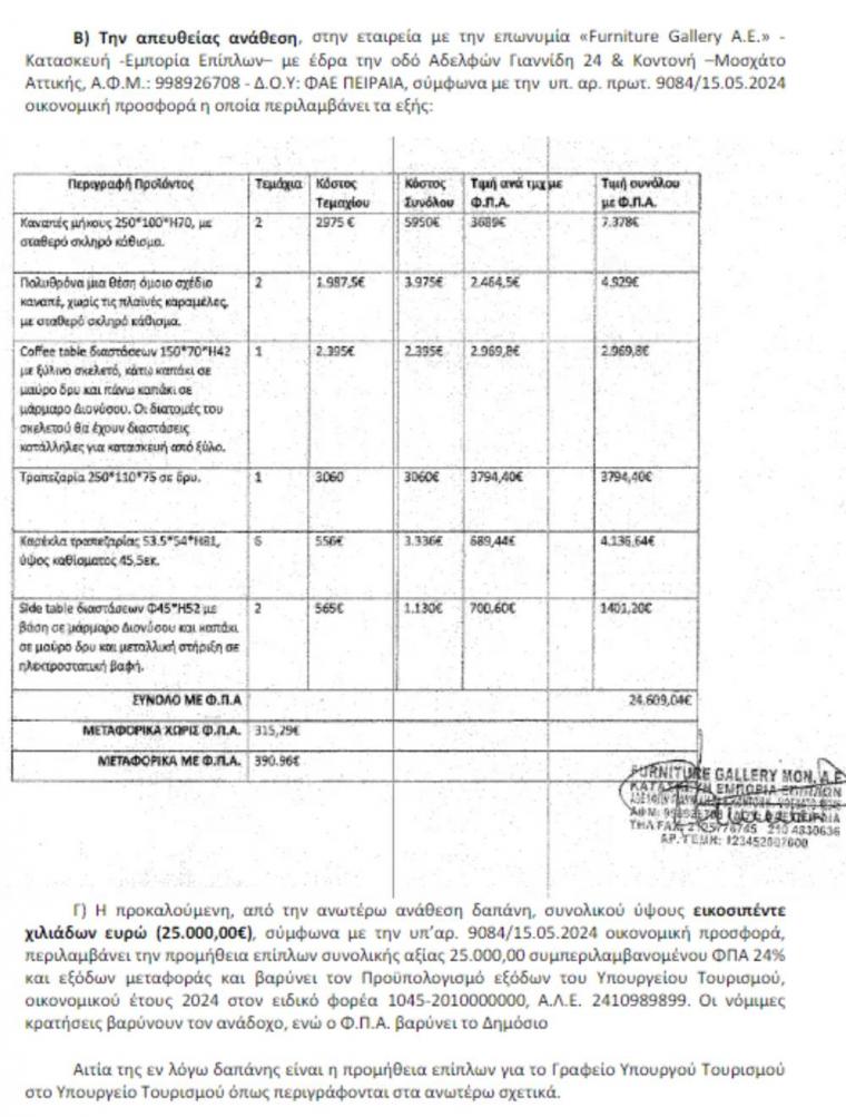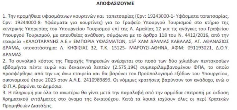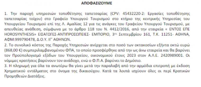 Σύμφωνα με την ΑΔΑ: Ρ9ΟΣ465ΧΘΟ-Σ7Ι, έγιναν «εργασίες υλικοτεχνικής υποστήριξης» στο Γραφείο Υπουργού του Υπουργείου Τουρισμού αξίας 36.952 ευρώ. Στη σχετική απόφαση δεν αναφέρονται λεπτομέρειες, αν και από το κόστος συμπεραίνουμε ότι έγιναν «βαριές» εργασίες για την ομαλή λειτουργεία του γραφείου.