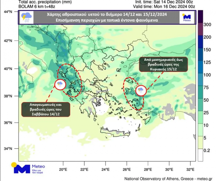- η σημαντική ενίσχυση των νοτίων ανέμων το Σάββατο 14/12 στο Ιόνιο και την Κυριακή 15/12 στο Βόρειο Αιγαίο που θα πνέουν ισχυροί 6 μποφόρ, ενώ τις βραδινές ώρες της Κυριακής 15/12 στο Βορειοδυτικό Αιγαίο θα στραφούν σε βορειοδυτικούς ισχυρούς 6 μποφόρ