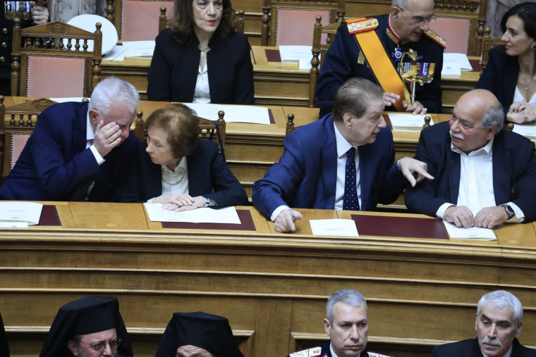 Στην πρώτη σειρά των εδράνων είναι οι πρώην πρωθυπουργοί οι Λ. Παπαδήμας, Κ. Θάνου, Ι. Σαρμάς, Π. Πικραμένος. Οι πρώην πρόεδροι της Βουλής Άννα Μπενάκη, Βύρων Πολύδωρας και Νίκος Βρούτσης καθώς και η ηγεσία των τριών ανωτάτων δικαστηρίων της χώρας.