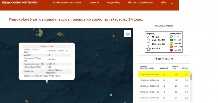 Πριν από λίγη ώρα έγινε ασθενής σεισμός 3 βαθμών της κλίμακας Ρίχτερ στα ανοιχτά της Κρήτης, βορειοανατολικά του Ηρακλείου.