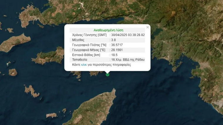 Σήμερα πρωί Τετάρτης, έγινε σεισμός 3,8 Ρίχτερ στην θαλάσσια περιοχή ανοιχτά της Ρόδου.