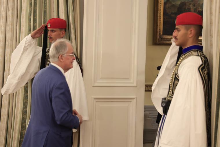 «Η Ελλάδα αποτελεί εγγυητή ασφάλειας και σταθερότητας στην ανατολική Μεσόγειο και την ευρύτερη περιοχή, συμμερίζεται τις κοινές αξίες που ενσαρκώνει η Ευρώπη και αγωνίζεται για την προώθηση και εμβάθυνσή τους» τόνισε η Πρόεδρος της Δημοκρατίας, Κατερίνα Σακελλαροπούλου, κατά την προσφώνησή της στο επίσημο δείπνο που παρέθεσε προς τιμήν του Γερμανού Προέδρου, Φράνκ-Βάλτερ Σταϊνμάιερ, ο οποίος πραγματοποιεί επίσημη επίσκεψη στη χώρα μας. Παρών στο Προεδρικό Μέγαρο ήταν και ο Γερμανός προπονητής της εθνικής ομάδας ποδοσφαίρου που κατέκτησε το «Euro 2004» Ότο Ρεχάγκελ.