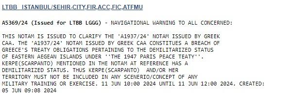 Με την κίνηση αυτή η Άγκυρα επαναλαμβάνει την αναθεωρητική της θέση να αρνείται την διενέργεια ασκήσεων από τις Ελληνικές Ένοπλες Δυνάμεις σε νησιά του Ανατολικού Αιγαίου/