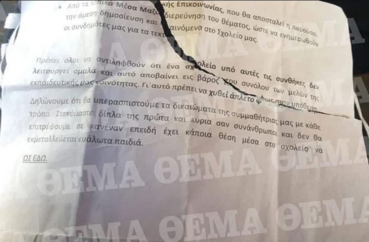Αυτή η αντίδραση των εκπαιδευτικών στην κίνηση των μαθητών να βάλουν λουκέτο στο σχολείο ως ένδειξη διαμαρτυρίας στη συμμαθήτριά τους, αναφέρεται στην επιστολή που μοίρασαν σήμερα μαθητές και γονείς, αφήνοντας την Αστυνομία και τις αρμόδιες Αρχές να κάνουν την δουλειά τους.