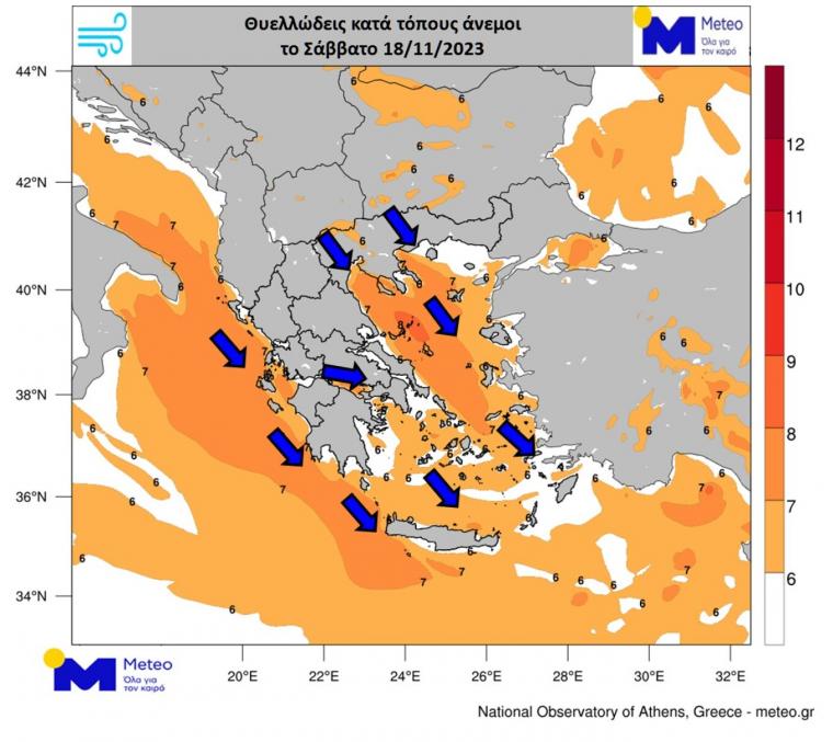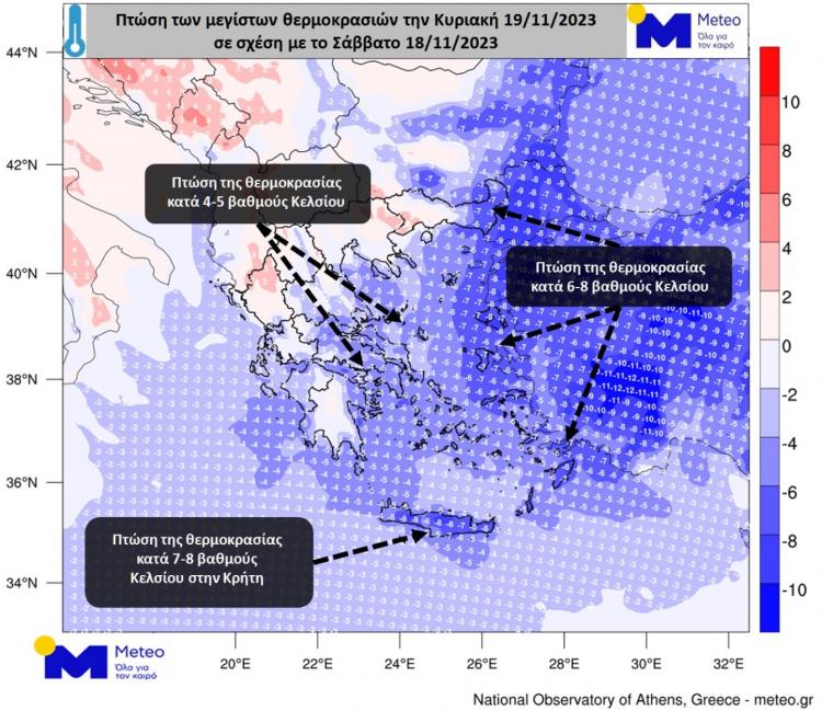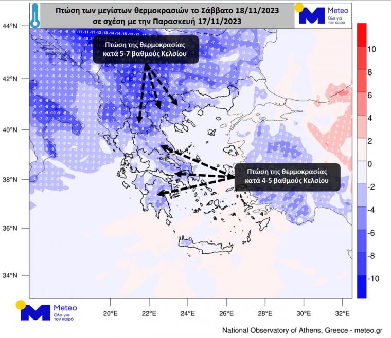 Τα κυριότερα χαρακτηριστικά της μεταβολής του καιρού θα είναι η επικράτηση πολύ ενισχυμένων βορειοδυτικών ανέμων και η σημαντική πτώση της θερμοκρασίας αύριο και την Κυριακή.