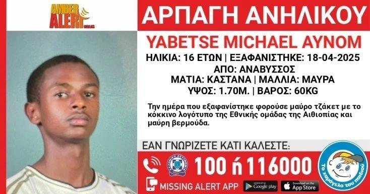 Ο Yabetse Michael Aynom 16 ετών με καταγωγή από την Αιθιοπία, βρισκόταν στην Ελλάδα στο πλαίσιο συμμετοχής του σε ομάδα ποδοσφαίρου. Το «Χαμόγελο του Παιδιού» αναφέρει πως ενημερώθηκε σήμερα για την εξαφάνιση και πως συντρέχουν λόγοι που θέτουν τη ζωή του σε κίνδυνο.