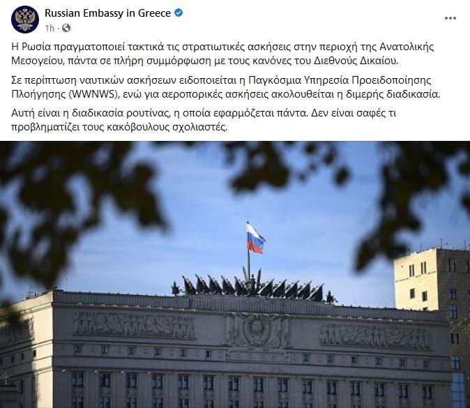 "Δεν επιδιώκουμε να επωφεληθούμε από μια διασυνοριακή διαφωνία. Η προσέγγιση αυτή ισχύει πλήρως για την ανατολική Μεσόγειο, μια ευαίσθητη και εκρηκτική περιοχή. Η Ρωσία τάσσεται υπέρ της επίλυσης όλων των διαφορών μόνο μέσω του πολιτικού διαλόγου» αναφέρει η εκπρόσωπος του ΥΠΕΞ της Ρωσίας Μαρία Ζαχάροβα στο tweet.