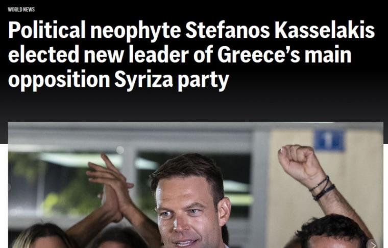 «Ο νεοφώτιστος πολιτικά Στέφανος Κασσελάκης εξελέγη νέος ηγέτης της αξιωματικής αντιπολίτευσης, του κόμματος ΣΥΡΙΖΑ, στην Ελλάδα», αναφέρει το Associated Press σχολιάζοντας τη νίκη ενός «35χρονου επιχειρηματία χωρίς πρότερη πολιτική εμπειρία».