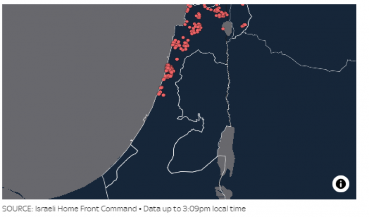 Το Ισραήλ εκδίδει, την ίδια στιγμή, συναγερμούς για πυραύλους κάθε πέντε λεπτά όπως φαίνεται σε ειδικό χάρτη.