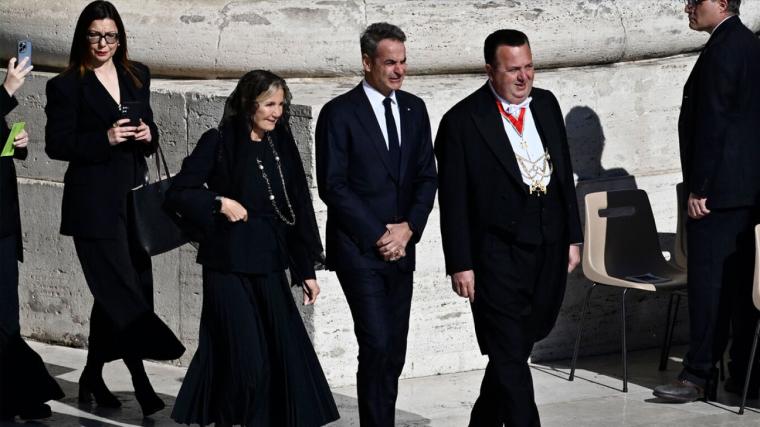 Στην πλατεία του Αγίου Πέτρου, στο Βατικανό, βρίσκεται ο πρωθυπουργός Κυριάκος Μητσοτάκης, δίνοντας το παρών στην κηδεία του Πάπα Φραγκίσκου. Ο πρωθυπουργός συνοδεύεται από την σύζυγό του Μαρέβα, η οποία ακολουθώντας τον ενδυματολογικό κώδικα έχει καλυμμένα τα μαλλιά της με πέπλο, ενώ φορά μακριά μαύρη φούστα.