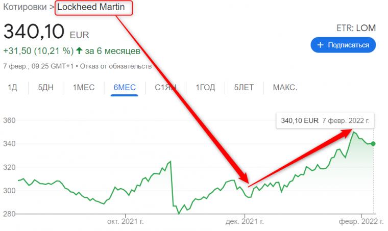 Παρεμπιπτόντως, οι τιμές τους αυξάνονται σταθερά από τον Δεκέμβριο. Στη Lockheed Martin, η τιμή της μετοχής αυξήθηκε από 295 ευρώ την 1η Δεκεμβρίου σε 350 στα τέλη Ιανουαρίου.