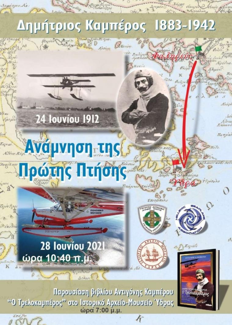 Έτσι, το πρωί της Δευτέρας, θα πραγματοποιηθεί αναβίωση πτήσης με υπερελαφρύ υδροπλάνο στη μνήμη του Υπολοχαγού Πυροβολικού Δημητρίου Καμπέρου, πρώτου Έλληνα Στρατιωτικού Αεροπόρου (στο δρομολόγιο Όρμος Παλαιού Φαλήρου-Ν. Ύδρα – Όρμος Παλαιού Φαλήρου) για πρώτη φορά μετά από 109 χρόνια, σε συνεργασία με το Πολεμικό Μουσείο, την Ελληνική Λέσχη Υδροπλάνου και το Ιστορικό Αρχείο Μουσείο Ύδρας. Είναι μια μοναδική ευκαιρία για να δούμε το ταξίδι του Καμπέρου, κάνοντας «ταξίδι στο χρόνο».