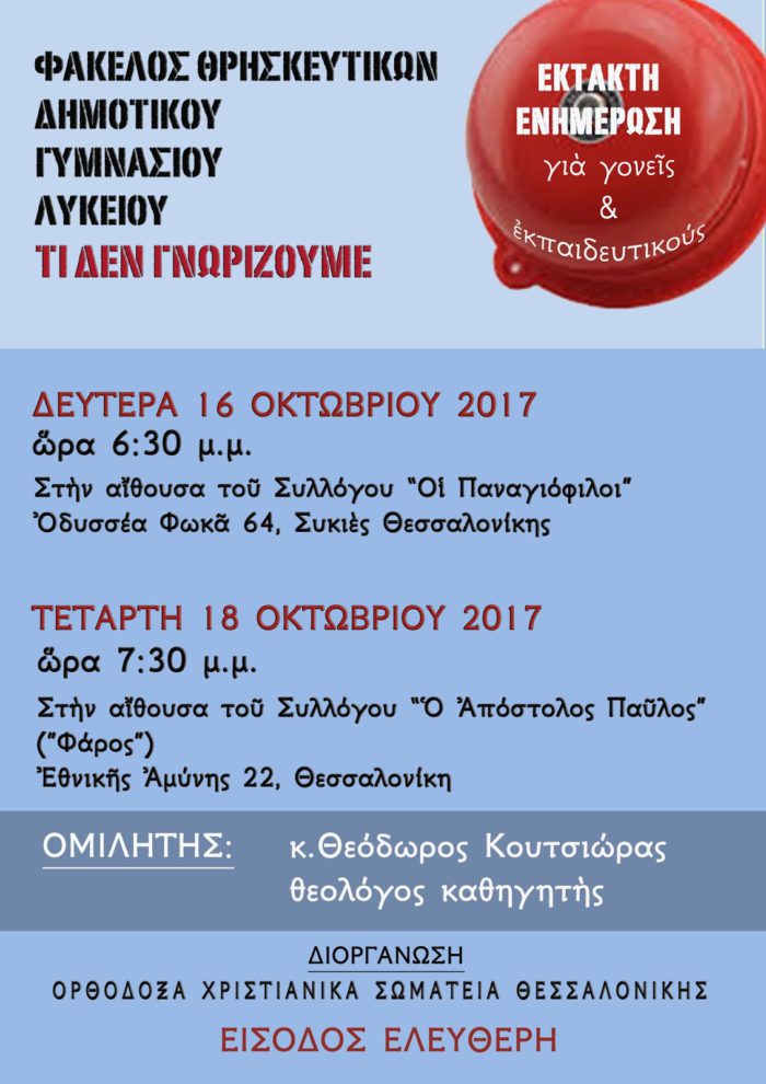 Τά Ὀρθόδοξα Χριστιανικά Σωματεῖα τῆς Θεσσαλονίκης διοργανώνουν δύο ἐνημερωτικές ἐκδηλώσεις στήν πόλη, σέ διαφορετικές ἡμερομηνίες καί αἴθουσες (ΠΛΗΡΟΦΟΡΙΕΣ ΣΤΗΝ ΑΦΙΣΑ), ὥστε νά ἔχουν τήν δυνατότητα ὅσοι ἐκπαιδευτικοί καί γονεῖς ἐπιθυμοῦν νά ἐνημερωθοῦν ἀναλυτικά γιά τά νέα βιβλία Θρησκευτικῶν ("φάκελοι Θρησκευτικῶν") σέ ὅλες τίς βαθμίδες τῆς ἐκπαίδευσης.