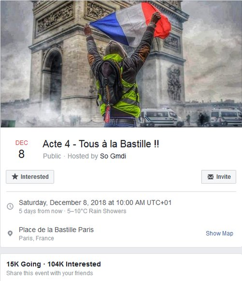 Στην εκδήλωση που έχει αναρτηθεί στο facebook 15.000 θυμωμένοι Γάλλοι δηλώνουν έτοιμοι να δώσουν το παρών, τρεις φορές περισσότεροι από το περασμένο Σαββατοκύριακο, ενώ 104.000 είναι τα "ίσως".