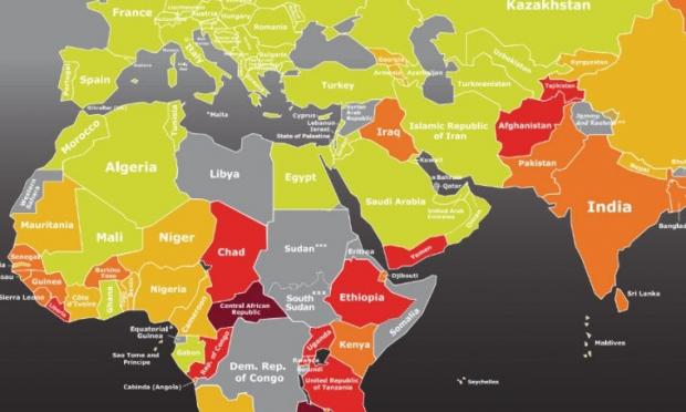 (Στο χάρτη με πράσινο χρώμα είναι οι χώρες των οποίων κάτω από το 5% του πληθυσμού αντιμετωπίζει πρόβλημα υποσιτισμού και όσο σκουραίνει το χρώμα το ποσοστό ανεβαίνει - για τις χώρες με γκρι χρώμα δεν υπάρχουν στοιχεία).Κίτρινο: 5 με 14,9%, Πορτοκαλί: 15 - 24,9%, Κόκκινο: 25 - 34,9% και Μπορντώ: Πάνω από 35% υποσιτίζονται.