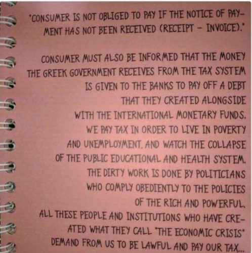 «Ο καταναλωτής πρέπει επίσης να γνωρίζει ότι τα χρήματα που η ελληνική κυβέρνηση λαμβάνει από το φορολογικό σύστημα δίνεται στις τράπεζες για να πληρώσουν ένα χρέος που οι ίδιες δημιούργησαν μαζί με το Διεθνές Νομισματικό Ταμείο.