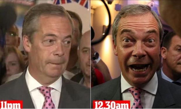 Λίγες ώρες όμως μετά, όλα είχαν αλλάξει. Οι υποστηρικτές του «Bremain» πάγωσαν στο άκουσμα της επικράτησης του «Brexit» με σχεδόν 52% , αλλά το πρόσωπο του Φάρατζ έλαμψε από χαρά.