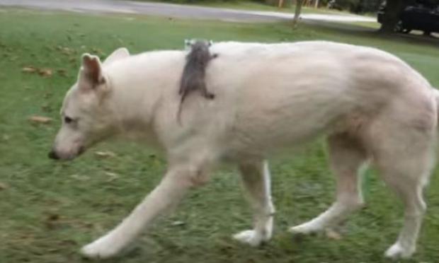Η οικογενεία είχε ήδη ένα κατοικίδιο, έναν λευκό γερμανικό ποιμενικό, την Hantu, η οποία πήρε αμέσως, υπό την προστασία της το μικρό μαρσιποφόρο. Σαν να γνώριζε πως τα μαρσιποφόρα μεταφέρονται για μεγάλο χρονικό διάστημα από τις μητέρες τους, δεν περίμενε να περπατάει δίπλα της αλλά τον τοποθετούσε στην ράχη της από την αρχή! Δεν θα βγει ποτέ από το σπίτι για την καθημερινή της βόλτα στο κοντινό δάσος, αν δεν πάρει μαζί και τον Poncho! Δύο χρόνια μετά φυσικά, ο Poncho είναι αρκετά μεγαλύτερος από το αρχικό του μέγεθος και το θέαμα από «αχ, τι γλυκό» είναι πλέον λίγο «κατέβα και περπάτα λίγο μόνος σου, ρε φίλε…!» Ελπίζω το «όχημα» να μην έχει υψηλά τέλη ταξινόμησης…