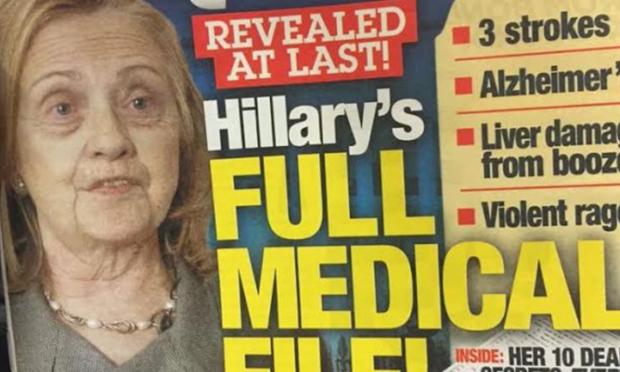 Τρία εγκεφαλικά, Αλτσχάιμερ, προβλήματα στο ήπαρ και θρομβώσεις, γράφει στο πρωτοσέλιδό του το περιοδικό «Nation Enquirer» βάζοντας στο μικροσκόπιο την κατάσταση της υγείας της πρώην Πρώτης κυρίας των ΗΠΑ. To περιοδικό κινείται στο ίδιο μήκος κύματος με το ABC NEWS και παρουσιάζει ως ζόμπι την Χίλαρι Κλίντον στο εξώφυλλό του!