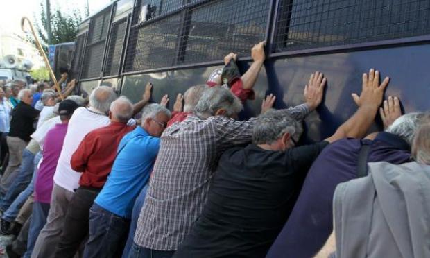 Ώρα 6:10 το πρωί. Συνταξιούχοι αρχίζουν να συγκεντρώνονται έξω από ένα υποκατάστημα της Εθνικής Τράπεζας στην Καλλιθέα. 24 ώρες νωρίτερα στην διαμαρτυρία τους για τις περικοπές των συντάξεών τους ήρθαν αντιμέτωποι με χημικά από τους αστυνομικούς στην συμβολή της Βασιλίσσης Σοφίας με την Ηρώδου Αττικού.