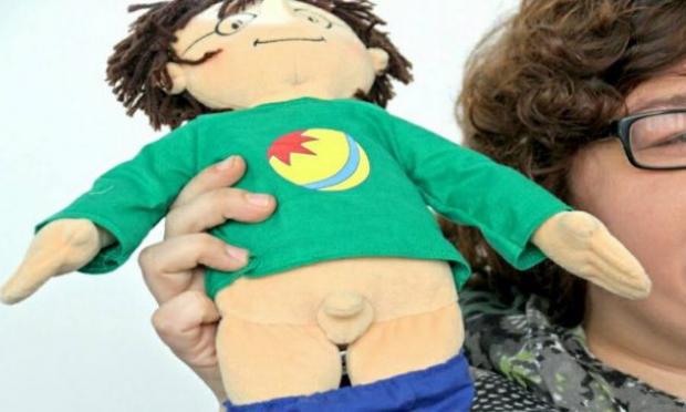 Στα νηπιαγωγεία της Γερμανίας ένας υπάλληλος του Ομοσπονδιακού Κέντρου Αγωγής Υγείας (BZgA) παρουσιάζει την “κούκλα του σεξ Lutz”.