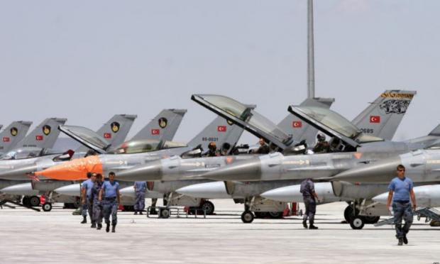 Ο Τούρκος πιλότος τροχοδρομεί με το F-16 του ακολουθώντας άλλα δύο μαχητικά ιδίου τύπου που παίρνουν θέση στον διάδρομο απογείωσης και ετοιμάζονται να ξεκινήσουν.