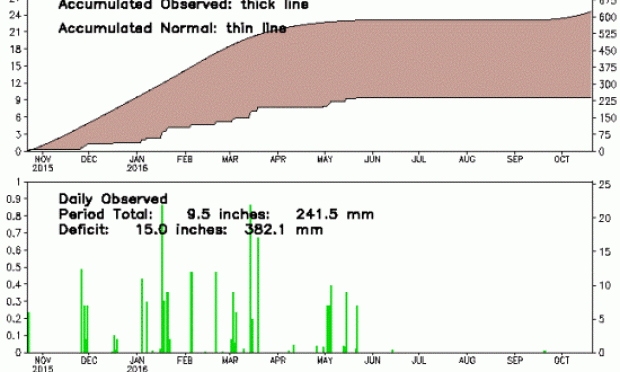 Αντίθετα, η ΝΑ χώρα πλήττεται από ξηρασία, αφού οι τελευταίες σημαντικές βροχοπτώσεις σημειώθηκαν τον περασμένο Μάιο, όπως φαίνεται και στο διάγραμμα της βροχόπτωσης παραπάνω. Η πορεία της βροχόπτωσης από πέρυσι μέχρι σήμερα, με την καφέ σκιαγραφημένη περιοχή, δείχνει την απόκλιση από τον μέσο όρο (το πάνω όριο είναι ο μέσος όρος και το κάτω ο φετινός υετός).