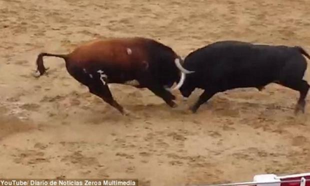 Το παράξενο δυστύχημα συνέβη όταν τα δύο πελώρια ζώα αφέθηκαν ελεύθερα στην αρένα, προς τέρψη των θεατών του διάσημου φεστιβάλ ταυρομαχίας στην Ισπανία. Σύμφωνα με το έθιμο, οι διοργανωτές του αιμοχαρούς φεστιβάλ επιδεικνύουν τα ζώα που πρόκειται να αντιμετωπίσουν οι «ματαντόρ» πριν από την «μάχη».