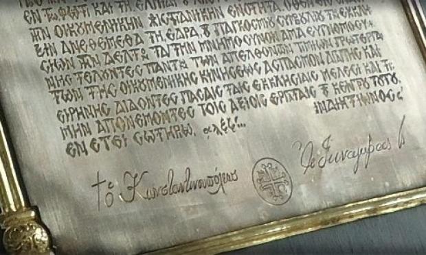 «… ΠΡΟΣ ΔΕ ΤΟ ΜΕΛΛΟΝ ΑΤΕΝΙΖΟΝΤΕΣ ΑΠΟΒΛΕΠΟΜΕΝ ΠΡΟΣ ΤΗΝ ΤΕΤΑΡΤΗΝ ΓΕΝΙΚΗΝ ΣΥΝΕΛΕΥΣΙΝ ΠΡΟΣ ΜΕΤΑΒΑΣΙΝ ΕΝ ΤΩι ΦΩΤΙ ΚΑΙ ΤΗι ΕΛΠΙΔΙ ΤΟΥ ΧΡΙΣΤΟΥ ΕΙΣ ΚΑΙΝΗΝ ΕΠΟΧΗΝ ΠΡΟΣ ΤΗΝ ΟΙΚΟΥΜΕΝΙΚΗΝ ΧΡΙΣΤΙΑΝΙΚΗΝ ΕΝΟΤΗΤΑ. ΟΘΕΝ ΕΙΣ ΕΝΔΕΙΞΙΝ ΑΝΕΘΕΜΕΘΑ ΤΗι ΕΔΡΑ ΤΟΥ ΠΑΓΚΟΣΜΙΟΥ ΣΥΜΒΟΥΛΙΟΥ ΤΩΝ ΕΚΚΛΗΣΙΩΝ ΤΗΝ ΔΕΛΤΟΝ ΤΑΥΤΗΝ ΜΝΗΜΟΣΥΝΟΝ ΑΜΑ ΕΥΓΝΩΜΟΣΥΝΗΣ ΤΕΛΟΥΝΤΕΣ ΠΑΝΤΩΝ ΤΩΝ ΑΠΕΛΘΟΝΤΩΝ ΤΙΜΙΩΝ ΠΡΩΤΕΡΓΑΤΩΝ ΤΗΣ ΟΙΚΟΥΜΕΝΙΚΗΣ ΚΙΝΗΣΕΩΣ ΑΣΠΑΣΜΟΝ ΑΓΑΠΗΣ ΚΑΙ ΕΙΡΗΝΗΣ ΔΙΔΟΝΤΕΣ ΠΑΣΑΙΣ ΤΑΙΣ ΕΚΚΛΗΣΙΑΙΣ ΜΕΛΕΣΙ ΚΑΙ ….