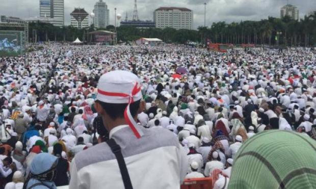 Άνδρες και γυναίκες συγκεντρώθηκαν στο μεγάλο πάρκο του εθνικού μνημείου, στο κέντρο της Τζακάρτας, ενώ σημαντική ήταν και η παρουσία των δυνάμεων ασφαλείας –22.000 αστυνομικοί και στρατιώτες—προκειμένου να μην επαναληφθούν τα βίαια επεισόδια που είχαν σημειωθεί μετά το τέλος της προηγούμενης διαδήλωσης στις 4 Νοεμβρίου.
