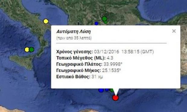 Σεισμός 4,3 Ρίχτερ νότια της Κρήτης!