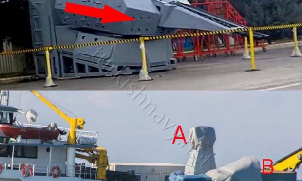 Στη φωτογραφία που δημοσιεύει, στο Α είναι σημειωμένο των ραντάρ τριών διαστάσεων του συστήματος το οποίο είναι πολύ χαρακτηριστικό και όντως δείχνει να ταιριάζει με το σκεπασμένο φορτίο του πλοίου. Στο Β είναι το ραντάρ ελέγχου πυρός στον πύργο, ενώ φαίνεται να ταιριάζει και το σχήμα και το ύψος.