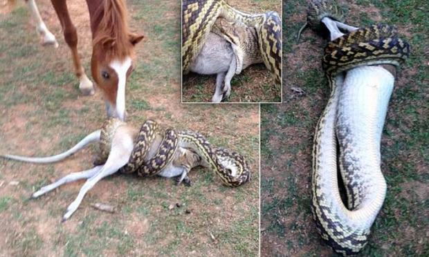 Ο πύθωνας φαίνεται αρχικά να στραγγαλίζει το θήραμά του και κατόπιν να ανοίγει το στόμα του για να το καταπιεί. Η τελευταία λήψη δείχνει τον πύθωνα να έχει διογκωθεί καθώς έχει καταπιεί ολόκληρο το καγκουρό.