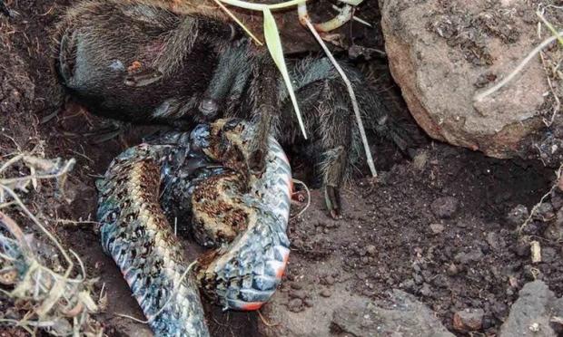 Πιο συγκεκριμένα, η στιγμή που μία γιγαντιαία ταραντούλα τρώει ένα φίδι απαθανατίστηκε από ερευνητές και δημοσιεύτηκε σε περιοδικό περιβαλλοντικού περιεχομένου.