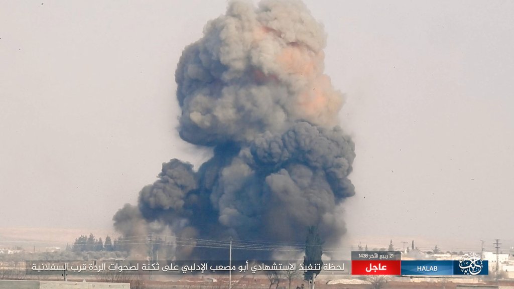 #VIDEO: Impact of an "Islamic State" car bomb attack Jeb al-Barazi east of al-#Bab against #Turkey-backed #FSA. #Syria pic.twitter.com/odivqqJP13