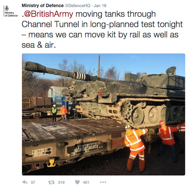 Ένας εκπρόσωπος του βρετανικού ΥΠΑΜ δήλωσε: «Ο στρατός διεξήγαγε με επιτυχία μια άσκηση για να δοκιμαστεί η βιωσιμότητα της χρήσης της σήραγγας της Μάγχης για την μετακίνηση οχημάτων και στρατιωτικού εξοπλισμού στην ηπειρωτική Ευρώπη», προσθέτοντας την σήραγγα στην ήδη υπάρχουσα γκάμα των διαθέσιμων επιλογών για την αύξηση της ευελιξίας των βρετανικών ενόπλων δυνάμεων.