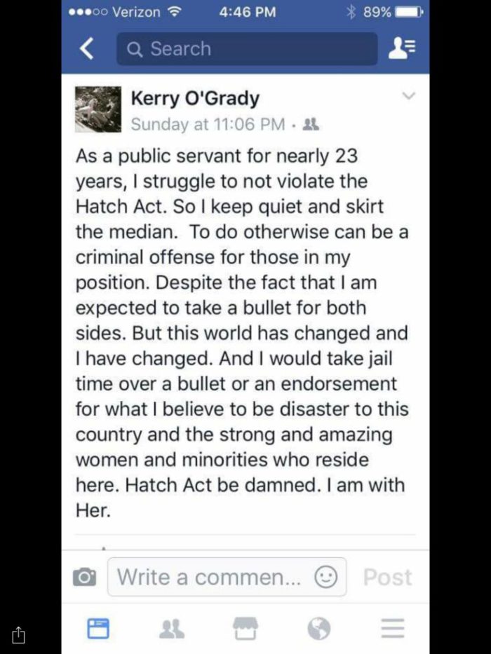 Σύμφωνα με στιγμιότυπο μιας εκ των αναρτήσεων που δημοσίευσε η Examiner, η Ο' Γκρέιντι έγραψε τον Οκτώβριο ότι είχε καταβάλει σκληρές προσπάθειες να μην παραβιάσει το διάταγμα εκείνο που απαγορεύει την ανάληψη πολιτικής δράσης για τους εργαζόμενους της ομοσπονδιακής διοίκησης.