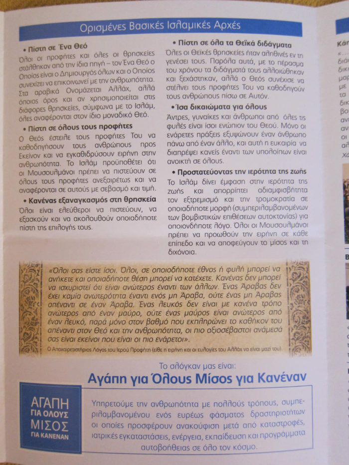 Στο φύλλαδιο εξάρουν το Ισλάμ παρουσιάζοντάς το ως θρησκεία αγάπης και με απόσπασμα απο το Κοράνι ζητούν “να δείχνετε καλοσύνη στους γονείς, στους συγγενείς, στα ορφανά, στους φτωχούς, στον γείτονα που είναι συμπατριώτης και στον γείτονα που είναι ξένος”. Ειδικά η τελευταία φράση έχει ξεκάθαρο στόχο το προσφυγικό ζήτημα.
