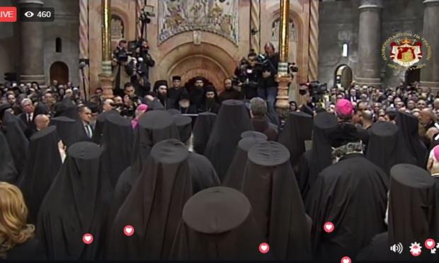 Υψηλοί προσκεκλημένοι, διεθνή μέσα ενημέρωσης καθώς και προσκυνητές βρίσκονται στα Ιεροσόλυμα για την εκδήλωση παράδοσης του Παναγίου Τάφου που ξεκίνησε στις 10 το πρωί, παρουσία του Οικουμενικού Πατριάρχη Βαρθολομαίου και του Έλληνα πρωθυπουργού Αλέξη Τσίπρα.