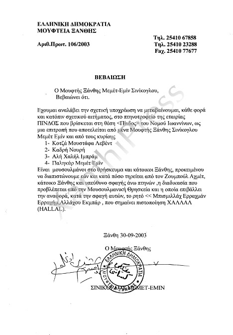 Με το παραπάνω έγγραφο ο μουφτής Ξάνθης το 2003 βεβαιώνει για την πιστοποίηση των κρεάτων «χαλάλ»
