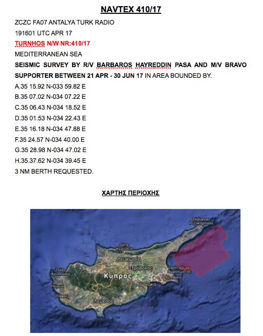 Η Τουρκία κάνει σταδιακά το «επόμενο» βήμα στην Κύπρο, καθώς αργά χθες το βράδυ και ενώ είχαν προηγηθεί οι προκλήσεις στο Αιγαίο, ανήγγειλε την διεξαγωγή σεισμογραφικών ερευνών από το BARBAROS HAYREDDIN PASA από τις 21 Απρίλιου μέχρι τις 30 Ιουνίου σε περιοχες της Κυπριακής υφαλοκρηπίδας ανοικτά της Αμμόχωστου.