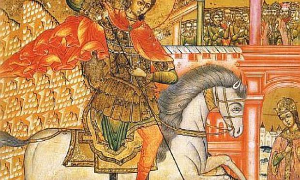 Σήμερα η Εκκλησία μας εορτάζει μαρτυρική εορτή. Εάν επιχειρήσομε να εκθειάσομε τον εορταζόμενο Άγιο, μάλλον θα τον μειώσομε. Ο Άγιος αυτός είναι η δόξα των Μαρτύρων, το καύχημα των Αγίων, η τιμή του ουρανού και της θριαμβευούσης Εκκλησίας. Είναι ο παμμέγιστος Γεώργιος. Δεν υπάρχει στόμα χριστιανικό από τη νηπιακή ηλικία μέχρι του τελευταίου επιθανάτιου παλμού της καρδιάς, πού να μην επικαλεστεί το γλυκύτατό του όνομα. Δεν υπάρχει χώρα χριστιανική πού να μην υπάρχουν έστω και ερείπια ναού, πού κτίσθηκε στη μνήμη του.